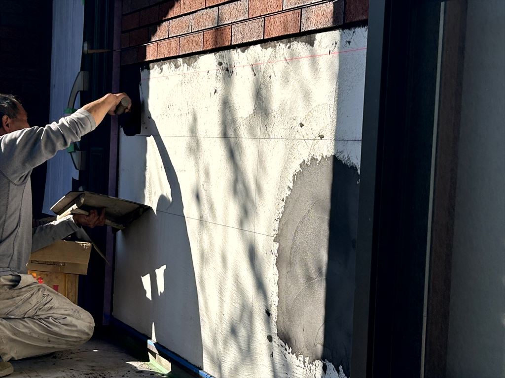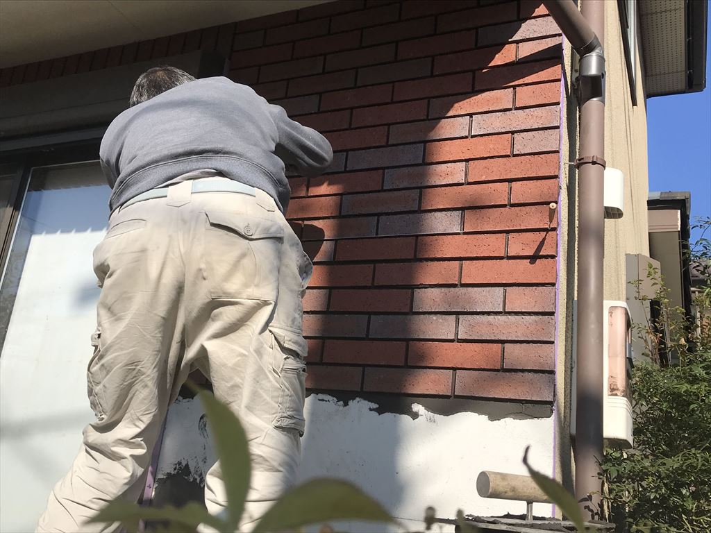 外壁タイル貼り工事 2022.11.15(Tue) BLOG 塗装仕上げの外壁に既存タイルと同じタイルを貼りたいというご要望があり、タイル貼り工事をさせていただきました。 既存とまったく同じタイルは廃盤で手に入らなかったため、いろいろなメーカーのタイルサンプルを取り寄せて、現場で色柄合わせをし、タイル選定を行いました。 違うメーカーのタイルですが、同じ風合いに仕上がり、施主様にもご満足いただけました。